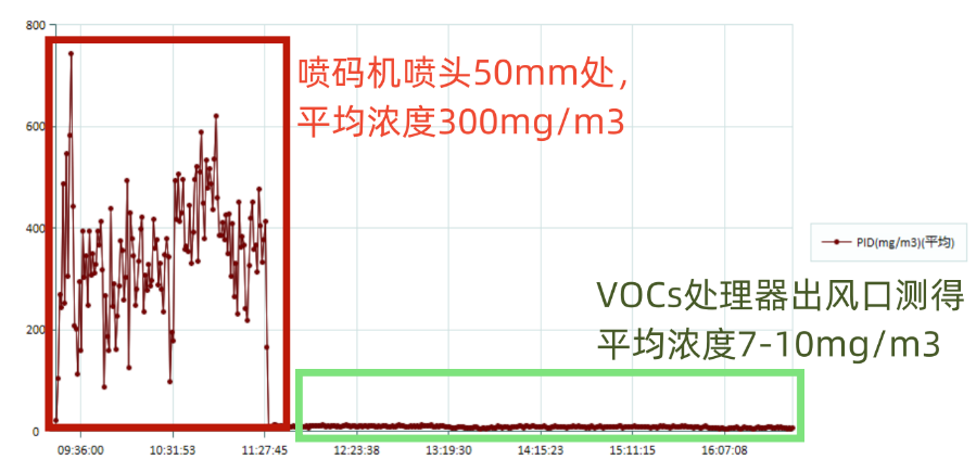经实验室测试,在未使用VOCs净化处理器前,喷码机喷头50mm处平均浓度为300mg/m³;当开启后,在VOCs净化处理器出风口测得平均浓度在7~10mg/m³。